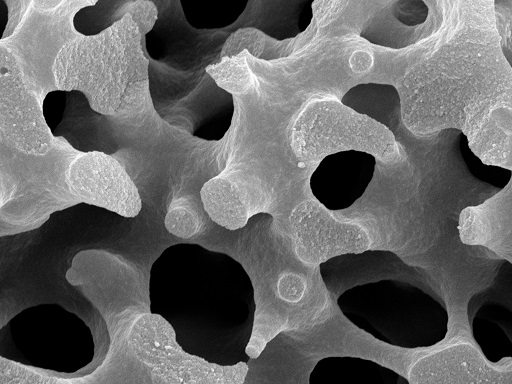 モノリスシリカゲルの断面をSEM(電子顕微鏡)画像で見るとナノメーター(nm)サイズ( メソ孔)とマイクロメーター(μm)サイズ(マクロ孔)の2種類の細孔が見えます。