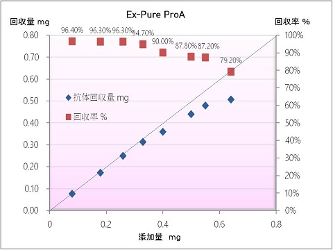 | Ex-Pure ProAをリガンドとしたスピンカラムで0.4mgまでのヒトIgGを90%以上の回収率で精製できます。(図2) また、各工程でのタンパク質量を0.3mgまでほぼ定量的に測定することが可能です |